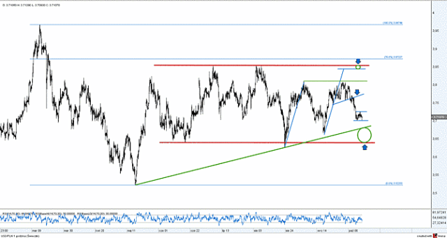 Moim zdaniem z większym prawdopodobieństwem należy oczekiwać przebicia pierwszego z wymienionych ograniczeń i kontynuacji sekwencji spadkowej zainicjowanej z początkiem bieżącego miesiąca. Docelowe zasięgi dla takiego scenariusza rozciągają się pomiędzy 3,64 a 3,68, gdzie dolne ograniczenie średnioterminowego trendu bocznego zbiega się istotną linią trendu poprowadzoną po minimach od połowy maja bieżącego roku. Moim zdaniem na tym poziomie dojdzie do uaktywnienia się strony popytowej, a w konsekwencji rozpocznie się budowanie kolejnej fali w ramach wspomnianej wcześniej kilkumiesięcznej konsolidacji.