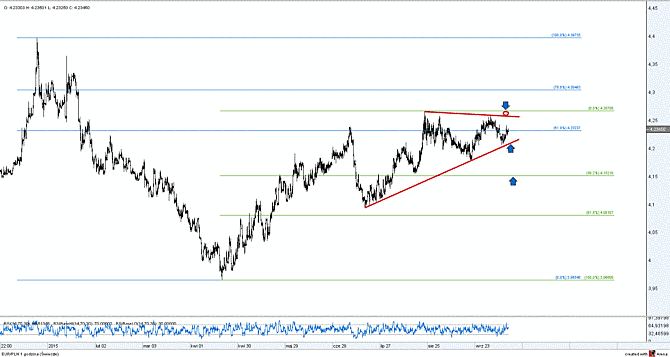 Na wykresie EURPLN trwa budowanie średnioterminowej konsolidacji. Kurs po odbiciu od jej dolnego ograniczenie zmierza powoli, aczkolwiek konsekwentnie na północ. W tej chwili docelowe zasięgi dla oglądanej zwyżki stanowią opory rozciągające się pomiędzy 4,2580 a 4,2670. Geneza tych poziomów została przedstawiona na wykresie powyżej. Przebicie tych oporów otworzyłoby drogę do umocnienia wspólnej waluty względem złotego w okolice 4,3050 (78% zniesienie spadków zainicjowanych na tym rynku pod koniec ubiegłego roku). Taki wariant jest na obecnym etapie wariantem preferowanym.