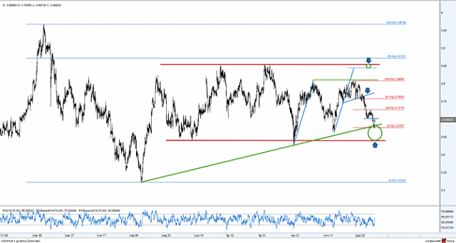 W konsekwencji notowania dotarły do wsparć rozciągających się pomiędzy 3,64 a 3,6815, których geneza została przedstawiona na wykresie powyżej (jak również w poprzednich komentarzach). Już górne rejony tej strefy doprowadziły do uaktywnienia się strony popytowej. Moim zdaniem jest to początek większego odbicia na tym rynku, bardzo możliwe, że właśnie stoimy u progu zbudowania nowej fali w ramach średnioterminowego trendu horyzontalnego. Sygnał do realizacji takiego scenariusza otrzymamy w momencie sforsowania oporów usytuowanych w rejonie 3,7015. Kolejnych barier, które będzie musiała w drodze na północ pokonać strona popytowa szukałbym w rejonie 3,7270 oraz 3,7580, gdzie znajdują się istotne zniesienia wspomnianej we wstępnie październikowej sekwencji spadkowej.