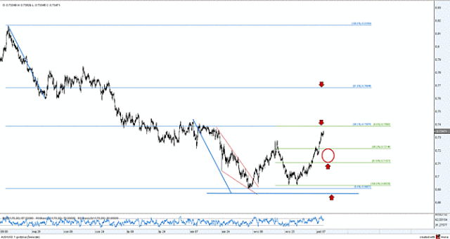 Trwa również dynamiczna zwyżka na rynku AUDUSD. Kurs tej pary niechybnie zbliża się do kluczowych oporów usytuowanych w rejonie 0,7390, tj. na 61% zniesienie sekwencji spadkowej zainicjowanej na tym rynku w połowie maja bieżącego roku. Moim zdaniem na wspomnianym poziomie z dużym prawdopodobieństwem można oczekiwać uaktywnienia się strony podażowej i wykształcenia przynajmniej większej korekty zwyżki, która na tym rynku została zainicjowana pod koniec poprzedniego miesiąca. Za takim scenariuszem przemawia również duże lokalne wykupienie na tym rynku, a docelowych zasięgów dla takiego wariantu szukałbym w rejonie 0,7105 – 0,7215 (patrz wykres powyżej).