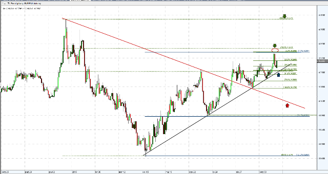 Impuls wzrostowy budujący się od 14 października wygląda już praktycznie na wypełniony, co może sugerować przynajmniej krótkoterminową spadkową korektę na tej parze, z modelowym zasięgiem w okolicy poziomu 3,80 (38,2% zniesienie odbicia z 14 października i linia trendu wzrostowego z genezą w tym samym dniu).