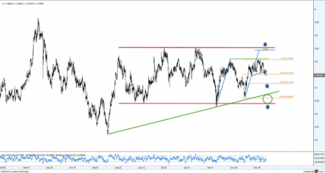 Kurs USDPLN po przebiciu wczoraj ważnych wsparć rozciągających się pomiędzy 3,7520 a 3,7630 próbował powrócić ponownie ponad te poziomy. Akcja popytu zakończyła się jednak niepowodzeniem i w efekcie kurs analizowanej pary otworzył sobie drogę do większej przeceny w szerszym horyzoncie. Najbliższe wsparcia dla takiego scenariusza znajdują się w rejonie 3,7175, ale docelowych zasięgów szukałbym dopiero w okolicach 3,64-3,6730. Na tym pułapie minima z połowy poprzedniego miesiąca zbiegają się z dolnym ograniczeniem średnioterminowego trendu bocznego. Taki wariant jest na obecnym etapie wariantem preferowanym.